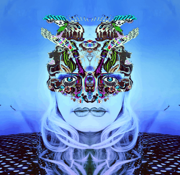 This is a series of self-portraits that explore my natural hallucinations which I started having in my early twenties. They have come back with a vengeance after leaving me for many years. This is a photo collage with previous drawings used to make a mask.