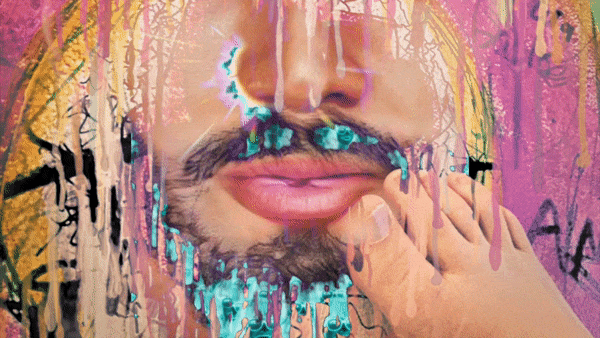 This GIF is really crazy in that it involves a real painted wall that my kid painted (in background), artificial intelligence (the moustached man was created with Artbreeder), video editing, and editing in a smartphone to create the painted drips. That foot is mine. So in all this animated GIF encompasses: physical paint, AI, collage in Gimp, video editing plus green screen effect and smartphone effects.
