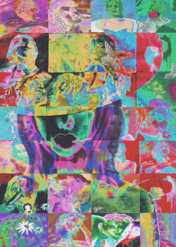 Riot of color and movement with the shifting mosaic tiles of Australias Kylie. Digital collage layer on a stock silhouette, with multiple hue and motion effects. 2 only ltd editions