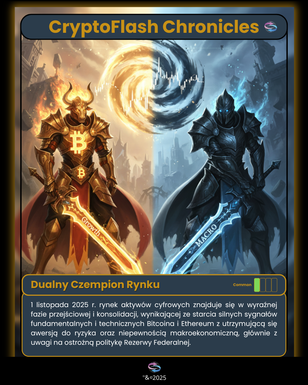 1 listopada 2025 r. rynek aktywów cyfrowych znajduje się w wyraźnej fazie przejściowej i konsolidacji, wynikającej ze starcia silnych sygnałów fundamentalnych i technicznych Bitcoina i Ethereum z utrzymującą się awersją do ryzyka oraz niepewnością makroekonomiczną, głównie z uwagi na ostrożną politykę Rezerwy Federalnej.