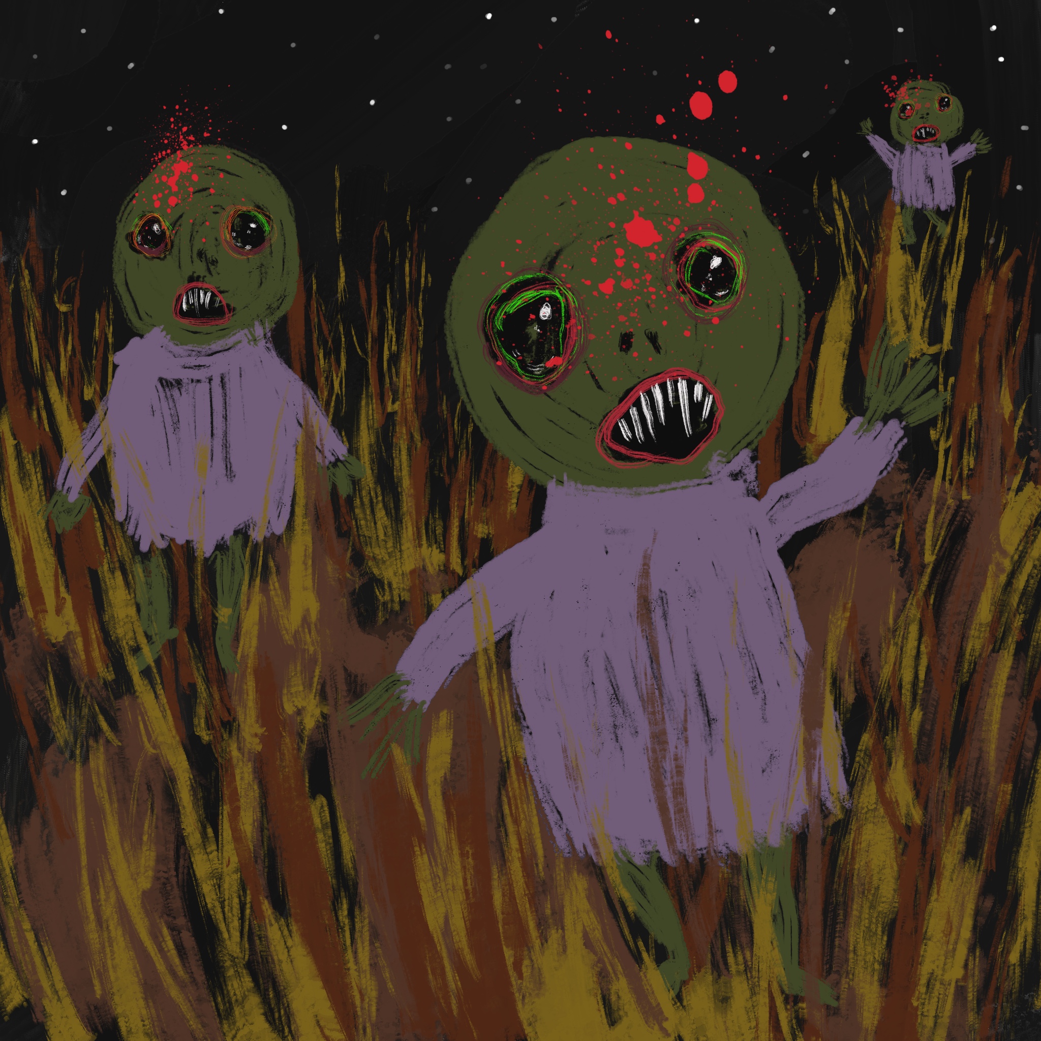 Zombies rush out from the long unkempt grass in an zombie attack, whilst you shoot them in the head. Created in Procreate on an iPad