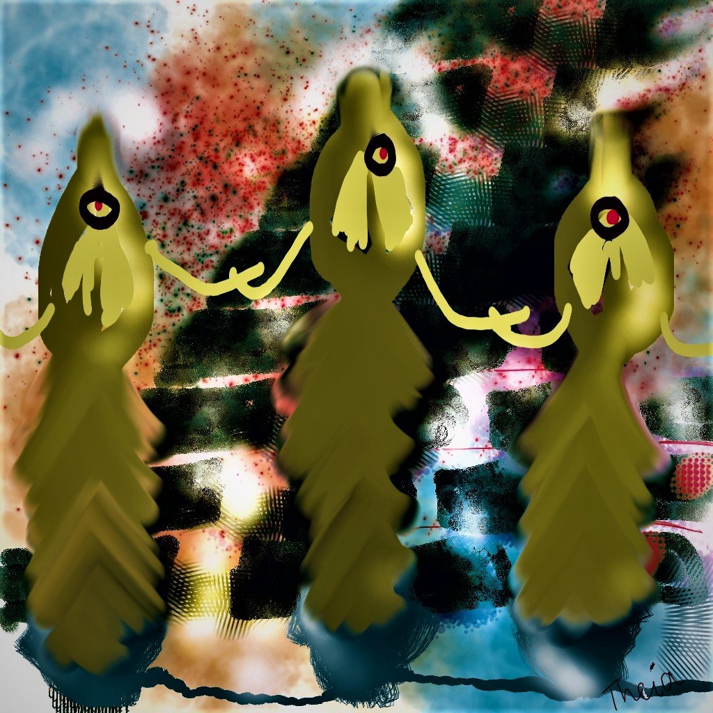 Three witches is my old digital work but I feel like it is contemporary art of everywhere. Three witches dancing and planning and they all got one eyeball. Something they are like a marmaid or fish like and with their wizardry energy they are now on the 5th dimension.