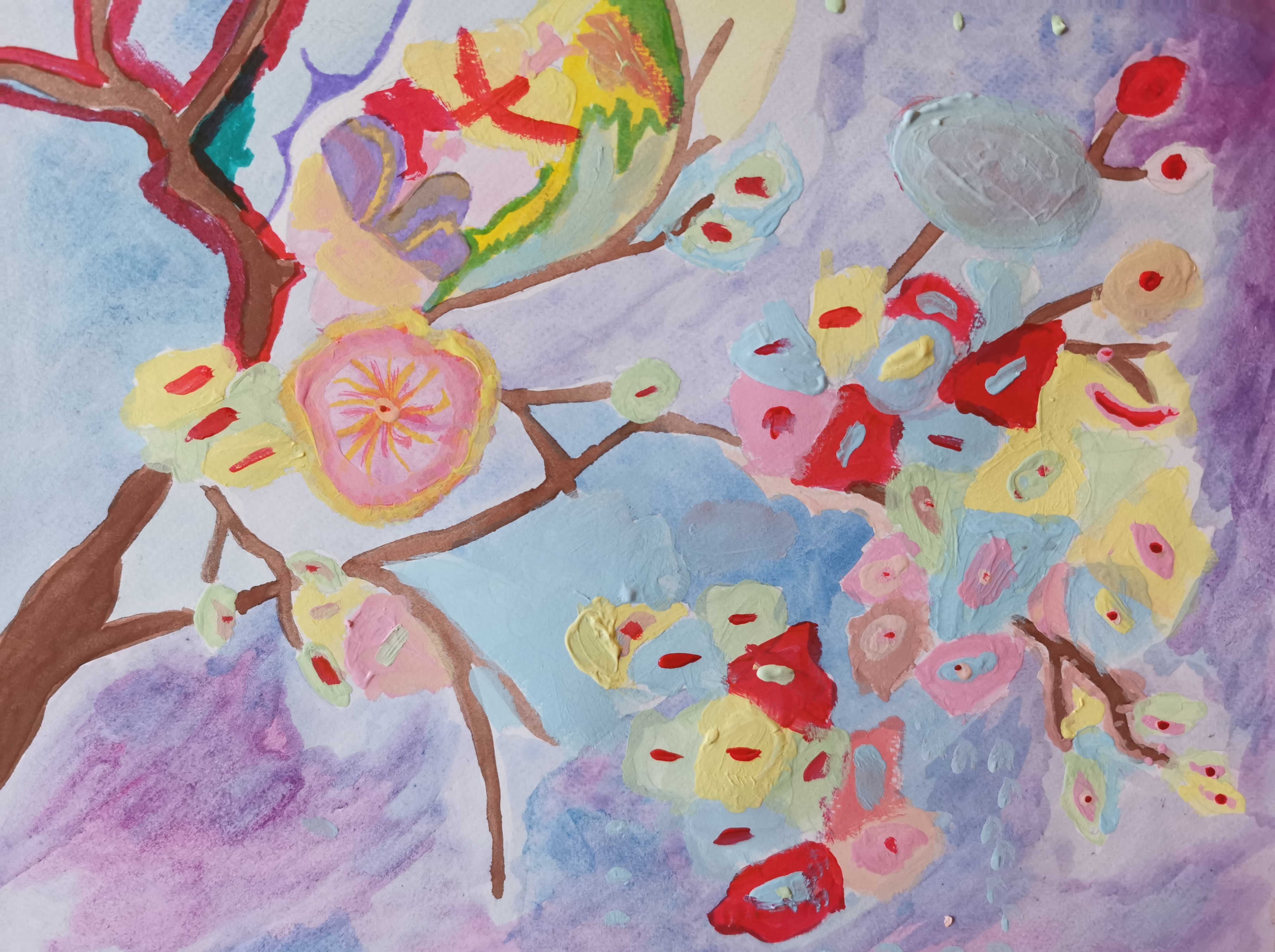 This artwork was originally created by myself using watercolor pencils. I never finished it as I never felt inspired again to do so. I asked my 6 year old daughter if she wanted to finish it with paint. And so she did. I love how this collaboration turned out and I bet this will be the first one in a long line of collabs between us.