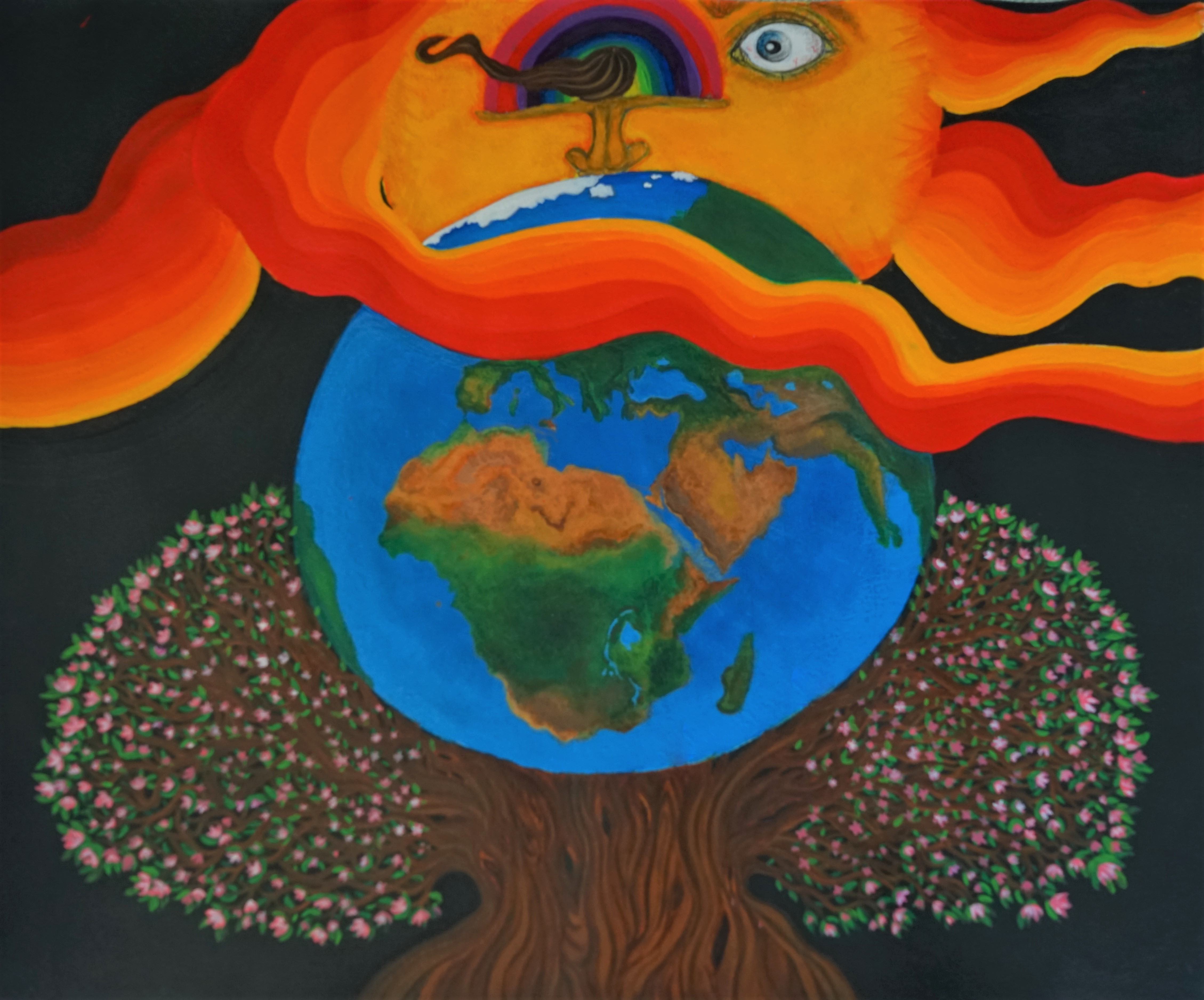 -Acrylic on Paper. This painting had been left unattended for about 2 years. It started out as a little sketch and nothing came out of it for 2 years. In 2019, after makingsome changes in my life, I decided to immerse myself into it, and make something out of it. This is the result. Our magical world which we often take for granted. The Sun's gaze represents it's importance for life to thrive on this wonderful planet. The tree represents the tree of life and how everything is connected to one another, just think of it's roots that run through the earth and touch another root. We should cherish what life has given us, we should cherish this world and it's boundless beauty and nourishment. We should not take this life on this special planet for granted! I ended up finishing it up through digital touch ups! I hope this piece will speak to someone as much as it does to me!
