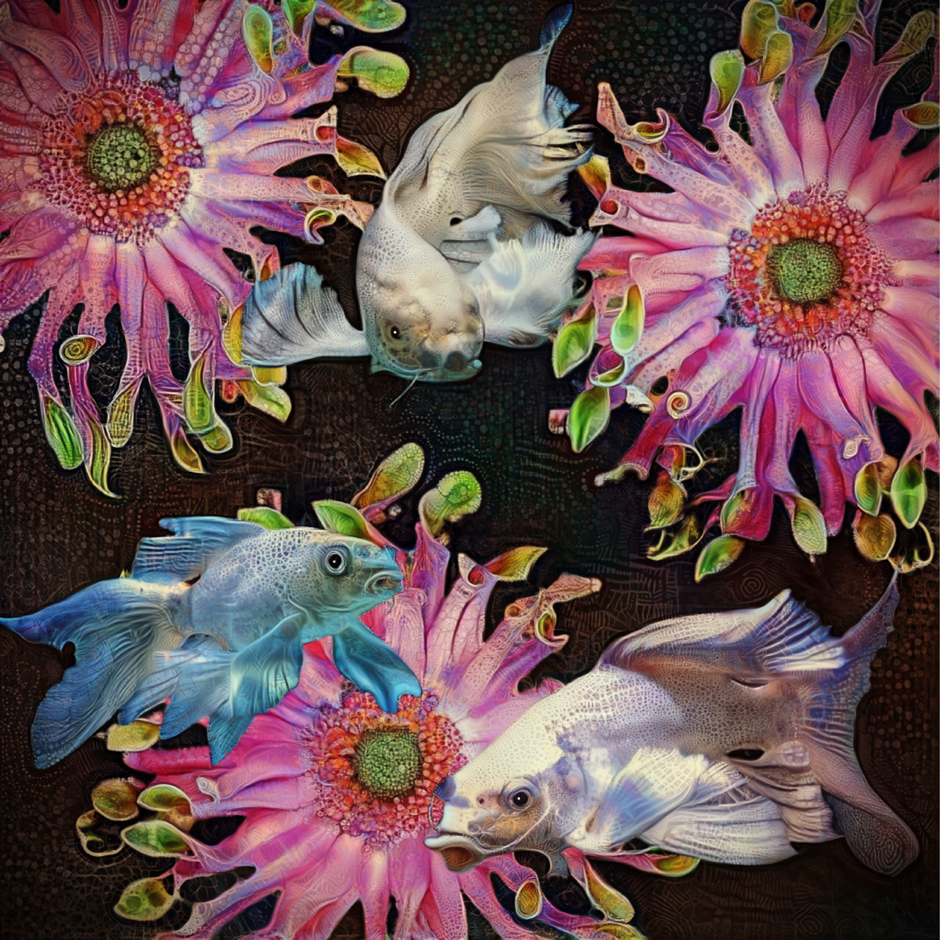 My friend Tanya took this picture of this unusual flower a while back and asked her if I could use it for a painting. As you might have noticed I have a thing for white koi- they just wanted to join the party