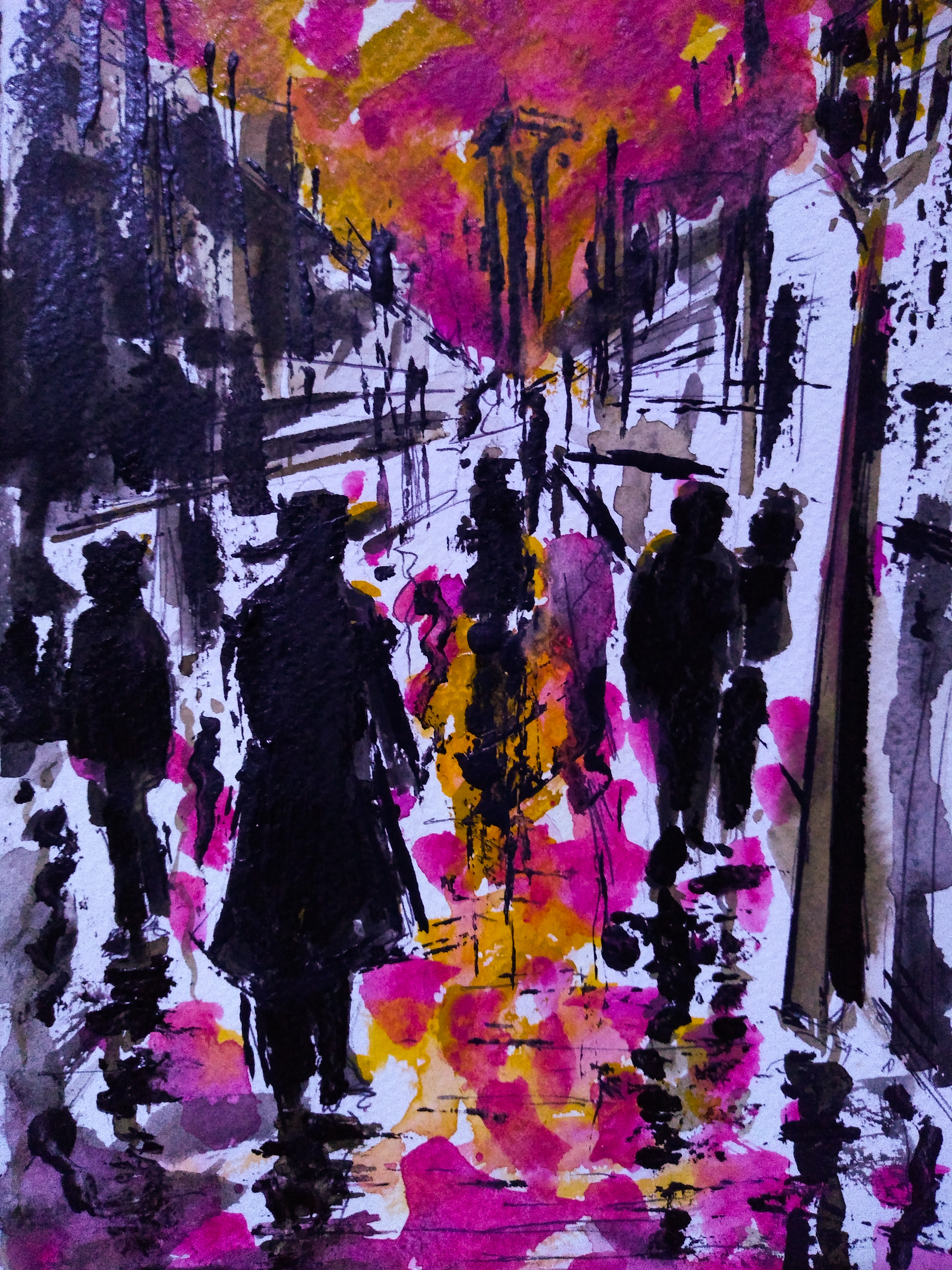 Watercolor and acrylic on Fabriano paper, this piece reflects how Venezuelan society was at some point in history, let's say 20 years ago ... At present the nights seem like a zombie movie, you can only see two extremes, people eating trash, and on the other hand plugged in (those who do business with the regime) repealing their licenses to kill and their new fortunes in grayscale.