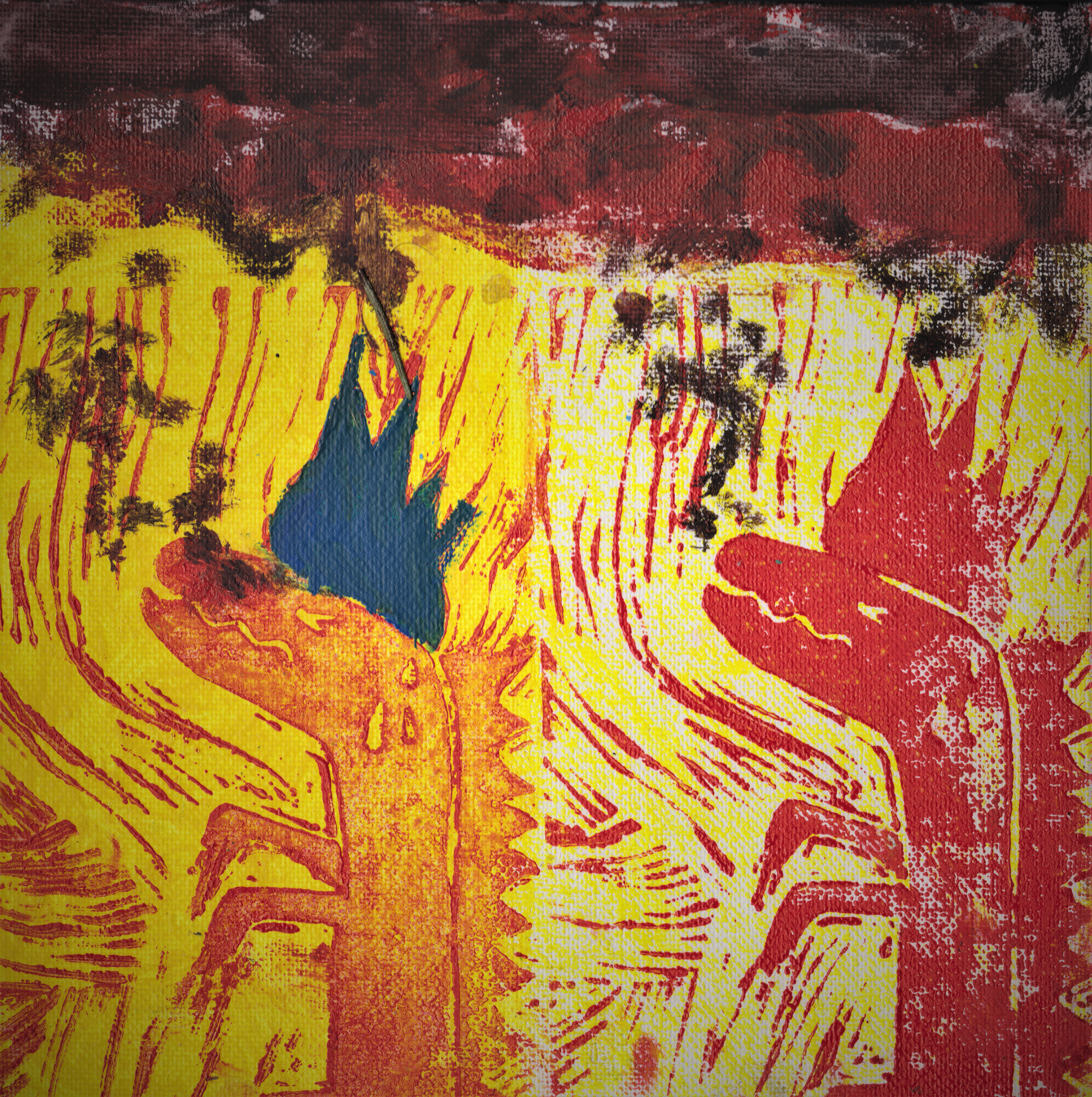I started carving and test inking and printing this two days ago, and today I really had fun with it. It eventually ended up as a double dino - consisting of a mix of lino print, oil pastel ( crayon ) and oil paint, pressed and painted on a canvas in several layers. I scanned it and made it look as good as possible.