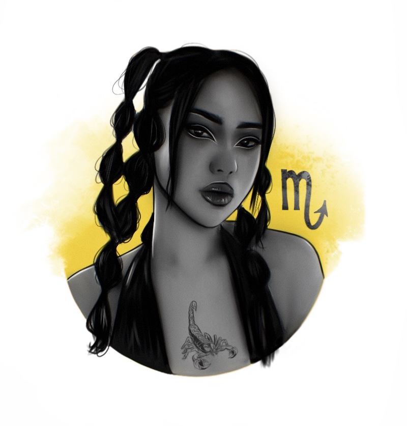 sketch of a girl personifying the zodiac sign Scorpio. Her tails are like a scorpion sting