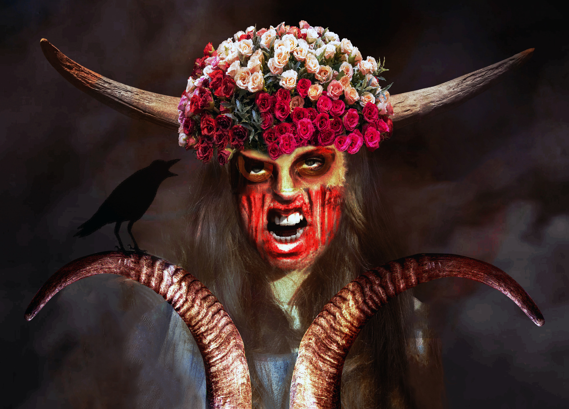 An outraged woman screaming so loud that there is blood on her face.
