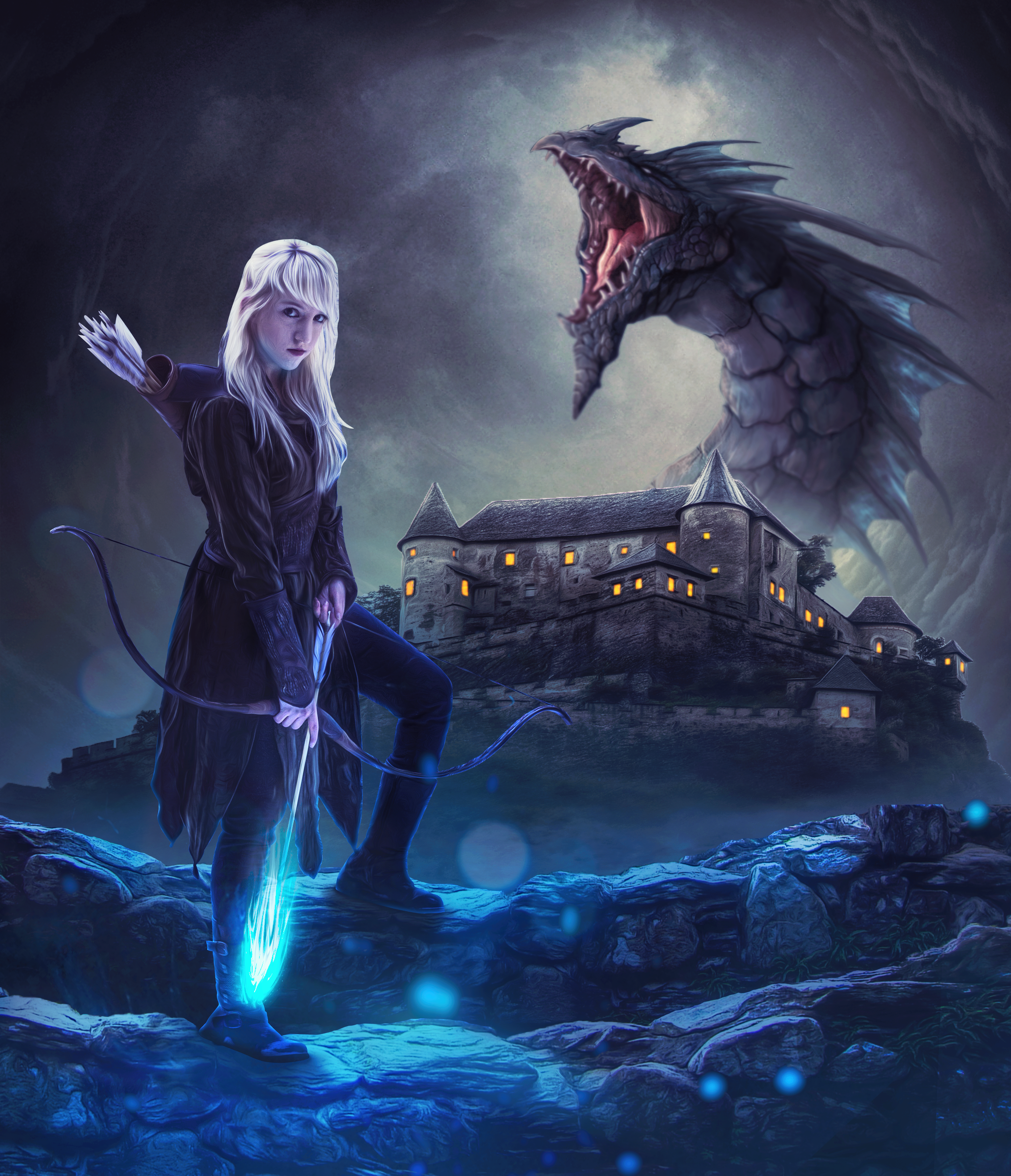 A Monster Hunter with a Monster behind the Castel background to the cloudy skylight effect and horror surreal effects.